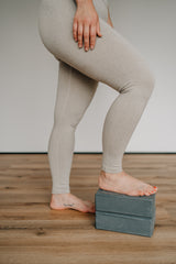 Stelle den rechten Fuß auf die Treppenstufe. Spanne den Beckenboden mit dem Ausatmen an und verlagere langsam das Gewicht vollständig auf das rechte Bein bis der linke Fuß nur noch mit den Zehenspitzen den Boden berührt. Hole viel Kraft dazu aus dem Becken – auch wenn der Oberschenkel hier natürlich sehr gebraucht wird – und wachse wieder ein Stückchen. Mit dem Einatmen verlagerst du dein Gewicht wieder auf den linken Fuß und setzst ihn ab.