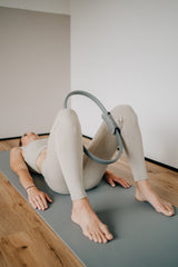 Position: Flach auf den Rücken legen, Arme parallel zum Körper und Pilates-Ring zwischen angewinkelte Beine (hüftbreit auseinander) etwas oberhalb der Knie klemmen und sanft zusammenpressen.