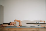In der Seitenlage: Kopf ruht auf dem ausgestreckten unteren Arm. Hand des oberen Armes stützend vor dem Brustkorb. Beine leicht anwinkeln. Schultern, Hüfte und Knie sind übereinander. Pilates-Ring zwischen den Oberschenkeln platzieren und sanften Druck ausüben. Blick nach vorn.