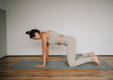 Aktivieren der Bauch- und Beckenbodenmuskulatur und Spannung halten. Ausatmen und Wirbelsäule vom Becken an Wirbel für Wirbel nach oben bis auf die Schultern rollen. Oben einatmen und mit der Ausatmung Wirbel für Wirbel nach unten rollen. Abwechselnd fortfahren.