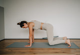 In a quadruped position: hands under shoulders and knees under hips. Open knees hip-width apart, neck extended, feet on toes. Place the Pilates ring between your thighs and apply gentle pressure.